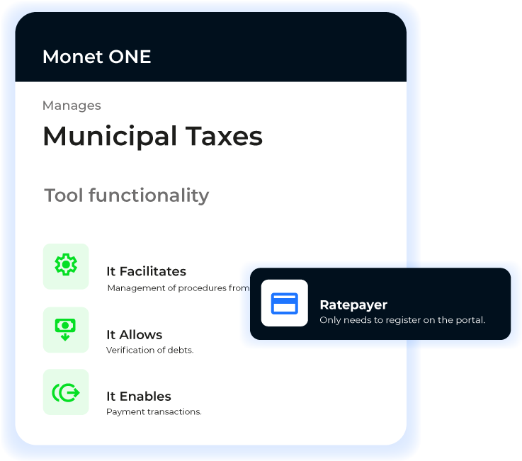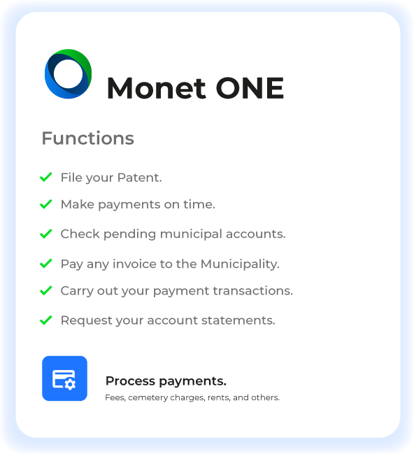 Monet One is the Web Portal for the Monet GFS application suite, responsible for collecting debts from taxpayers and filing Municipal Patent (Business License) applications. Thanks to the native integration between Monet One and Monet AR (Revenue Module), every filing or payment is immediately reflected in the revenue module and across all other system modules.