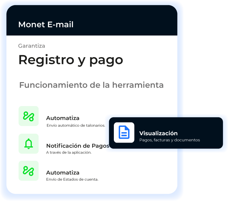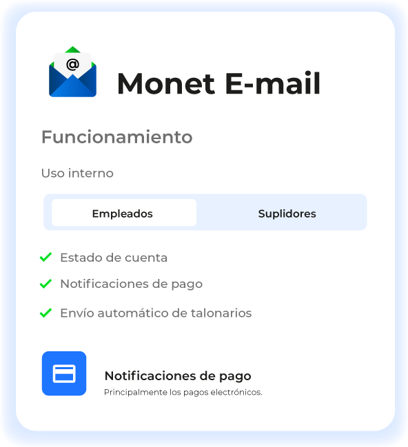 Monet EMAIL es un módulo que permite el envío de correos electrónicos a suplidores ,empleados y negocios, incluyendo notificaciones de confirmación de pago, talonarios y estados de cuenta.